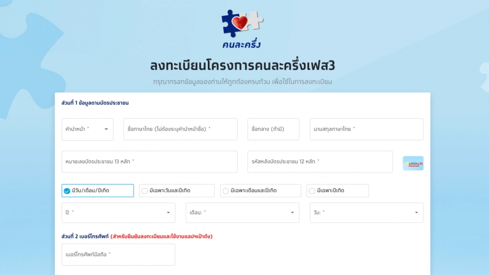 โครงการคนละครงเฟส 3 ลงทะเบยนวนไหน คนละครงเฟส 3 คนเกาทไดสทธ ไมตองสมครใหม. คนละครงเฟส 3 ลงทะเบยนวนไหน RH Wwwthairathcoth. ประชาชนแหลงทะเบยนเขารวมโครงการ คนละครง รอบ 2 เพอรบสทธเงน 3000 บาท วนแรกครบแลวกวา 25 ลานสทธ พรอมยำผทรบสทธ ตอง.