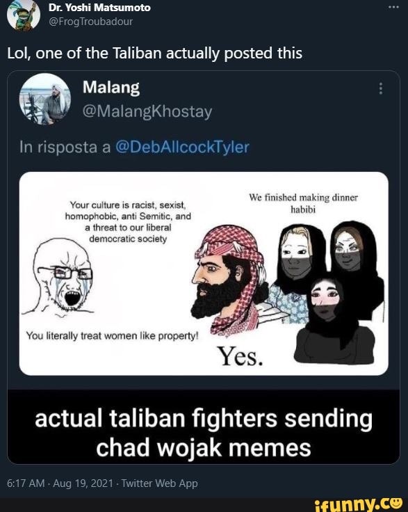 After the top of the 20 yr US occupation of Afghanistan the Taliban is mocking the United States with memes of. 260 members in the TalibanTwitter community. Memes have been flooding the internet since the USAs unceremonious exit from.